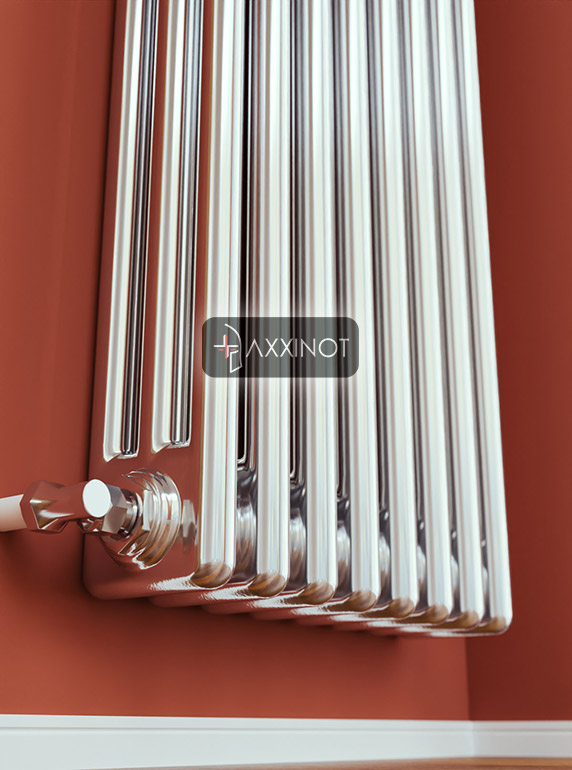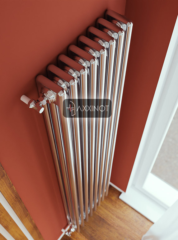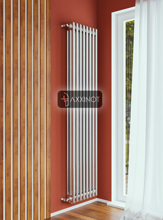Вертикальный трехтрубный дизайн-радиатор Axxinot Sentir Chrome 3180 — это впечатляющее архитектурное решение для интерьеров с высокими потолками и свободными вертикальными поверхностями. Высота 1800 мм превращает прибор в эффектную скульптурную композицию, которая не только обогревает помещение, но и задает его пространственную геометрию. Три горизонтальных коллектора и множество вертикальных трубок создают насыщенную фактурную поверхность, которая притягивает взгляд и становится главным акцентом интерьера.