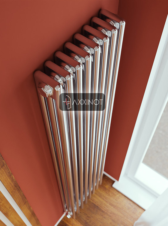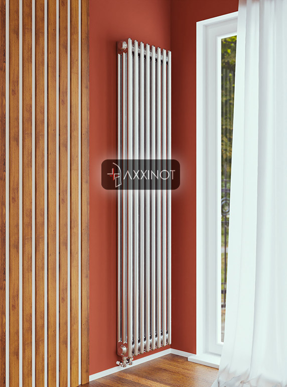 Вертикальный трехтрубный дизайн-радиатор Axxinot Sentir Chrome 3180 с нижним подключением — это впечатляющее архитектурное решение для интерьеров, где высота стен становится активным дизайнерским ресурсом. Высота 1800 мм превращает прибор в эффектную скульптурную композицию, которая не только обогревает помещение, но и задает его пространственную геометрию. Три горизонтальных коллектора и множество вертикальных трубок создают насыщенную фактурную поверхность, притягивающую взгляд и формирующую стиль всего интерьера.