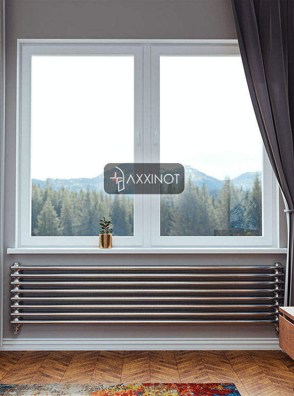 Двухтрубная конструкция с горизонтальной ориентацией создает мощный конвективный поток, который равномерно распределяет тепло по помещению. Это идеальное решение для установки вдоль стен, под окнами или в качестве зонирующего элемента в студиях и просторных гостиных. Зеркальная поверхность отражает свет и окружающие предметы, визуально облегчая массивную конструкцию и добавляя интерьеру глубины и перспективы.